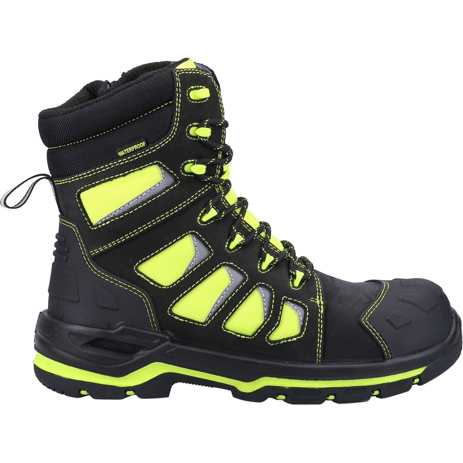 Hi-Leg Metal Free Hi-Vis Safety Boot with YKK side zip has been developed to tackle all types of industries in most adverse conditions. Hi-Vis fluorescent waterproof Cordura ensures maximum visibility at any time of day. - Metal Free Boot with Yellow Safety Hi Viz Waterproof CORDURA - Water Resistant Full Grain Nubuck Leather Upper - Internal Waterproof Membrane