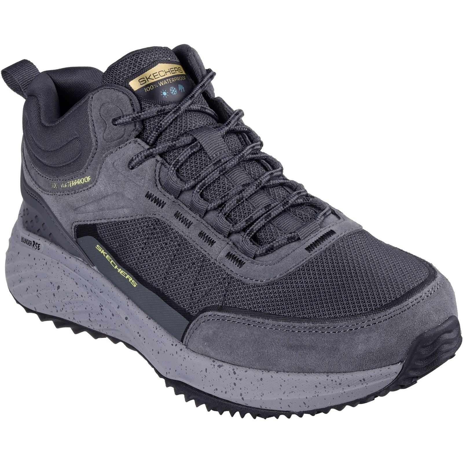 Stay active in flexible trend-forward style and comfort wearing Skechers Bounder RSE. This lace up sneaker boot features a 100% nubuck waterproof nubuck upper, a well-cushioned midsole, and a Skechers Air-Cooled Memory Foam insole. - Skechers Air-Cooled Memory Foam comfort insole - Trend-forward lace-up trainer boot with heel tab - Flexible traction outsole